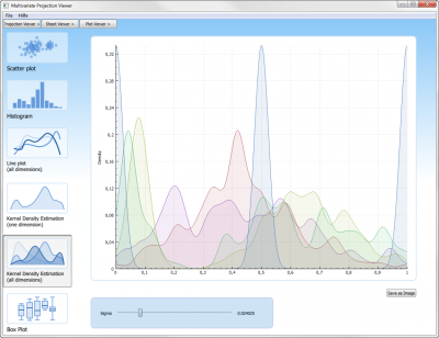 Fig: Die Kernel Density Estimation (KDE, dt. “Kerndicheschätzung”) beschreibt die Verteilung der Werte innerhalb einer Dimension und ist damit mit dem Histogramm vergleichbar. Statt die Werte in Klassen einzuordnen werden hier eine Normalverteilungen benutzt, um die Dichte der Werte darzustellen. Im Einstellungsbereich lässt sich die Dimension auswählen sowie die Bandbreite (Sigma) der Normalverteilungen.